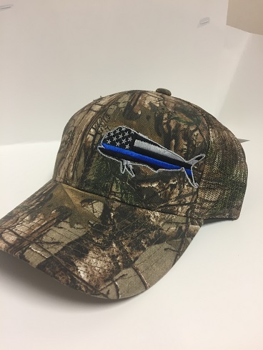 Realtree brand hat with meshback, and adjustable velcro closure. MahiMerica blue line flag logo. Shipping only $5.00!